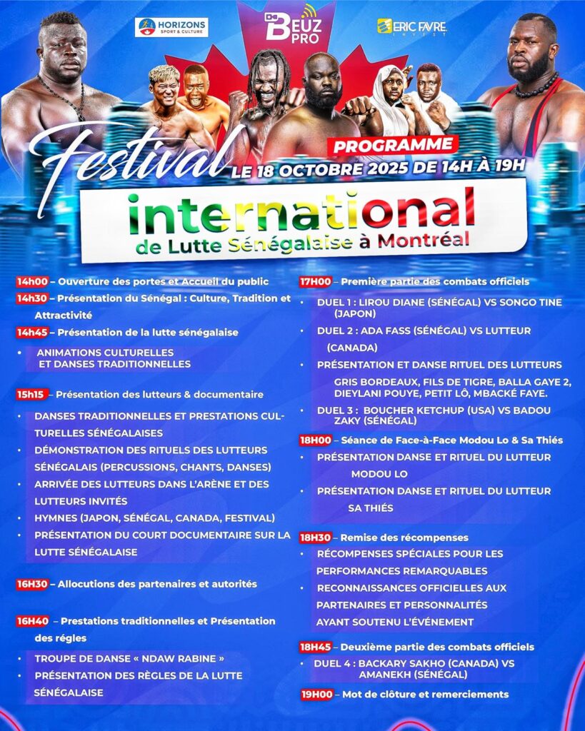 Montréal s’apprête à vibrer au rythme de la lutte sénégalaise ce samedi 18 octobre, à l’occasion du Festival international de lutte africaine, qui se tiendra au Centre Pierre-Charbonneau. Cet événement unique marquera le tout premier face-à-face officiel à l’étranger entre Modou Lô, le roi des arènes, et Sa Thiès, son redoutable adversaire dans le combat programmé pour le 5 avril 2026 à Dakar.