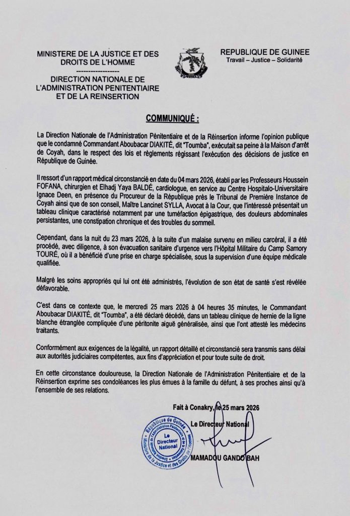 XALIMANEWS: Aboubacar Sidiki Diakité, plus connu sous le nom de Toumba Diakité, est décédé le 25 mars 2026 à Conakry, en Guinée. L’information, confirmée par plusieurs sources locales, met fin à des années de spéculations autour de son état de santé, lui qui était détenu et suivi pour des problèmes médicaux, selon les autorités guinéennes.