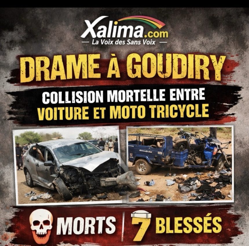 XALIMANEWS: Une collision entre un véhicule particulier et une moto tricycle, survenue samedi entre Kidira et Goudiry, dans la région de Tambacounda (est du Sénégal), a fait trois morts et plusieurs blessés, a appris l’APS de sources concordantes.