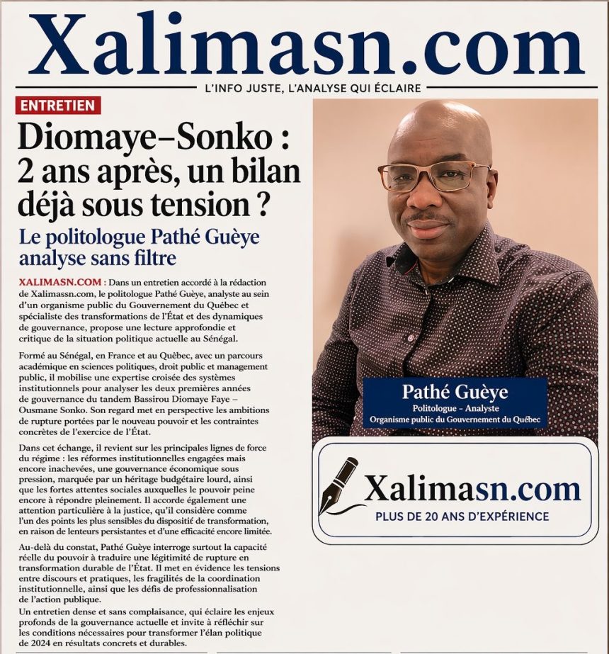 XALIMANEWS: Dans un entretien accordé à la rédaction de Xalima, le politologue Pathé Guèye, analyste au sein d’un organisme public du Gouvernement du Québec et spécialiste des transformations de l’État et des dynamiques de gouvernance, propose une lecture approfondie et critique de la situation politique actuelle au Sénégal.